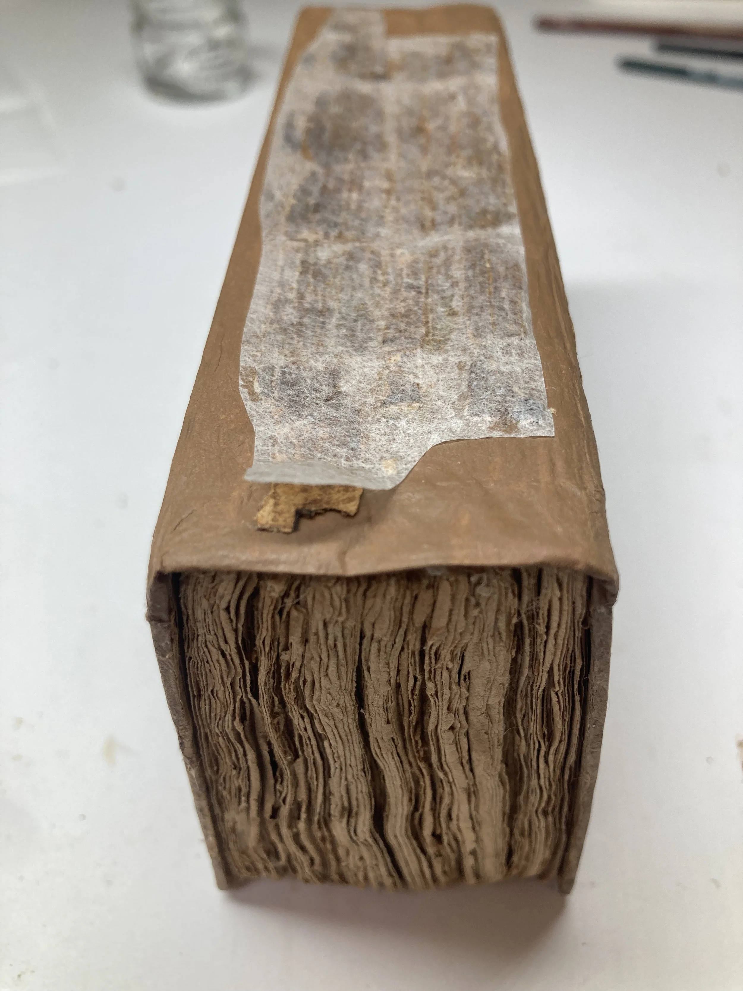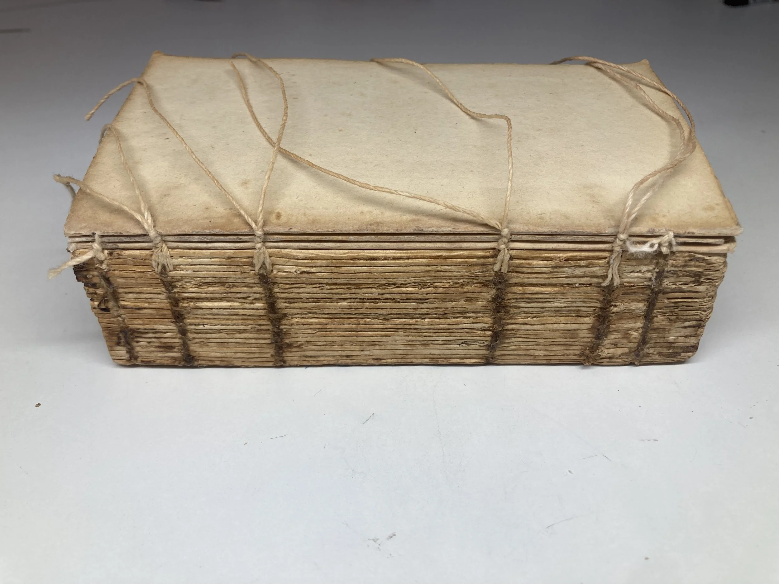Paper binding with millboard boards sewn on four recessed cords with two-on style sewing. Front and back board detached. Spine was cracked vertically with considerable losses at head and tail. The first three gathering on the textblock were loose.