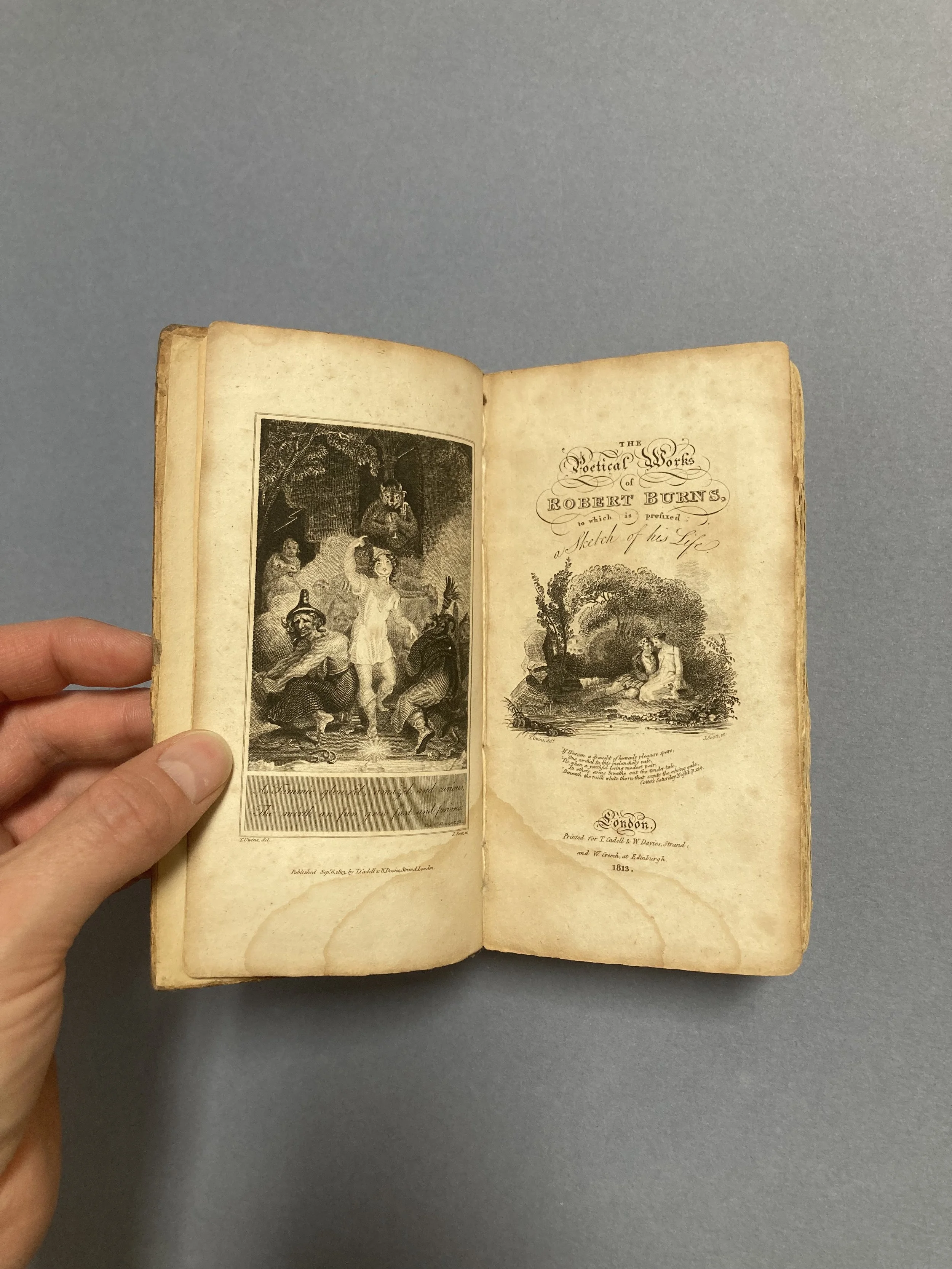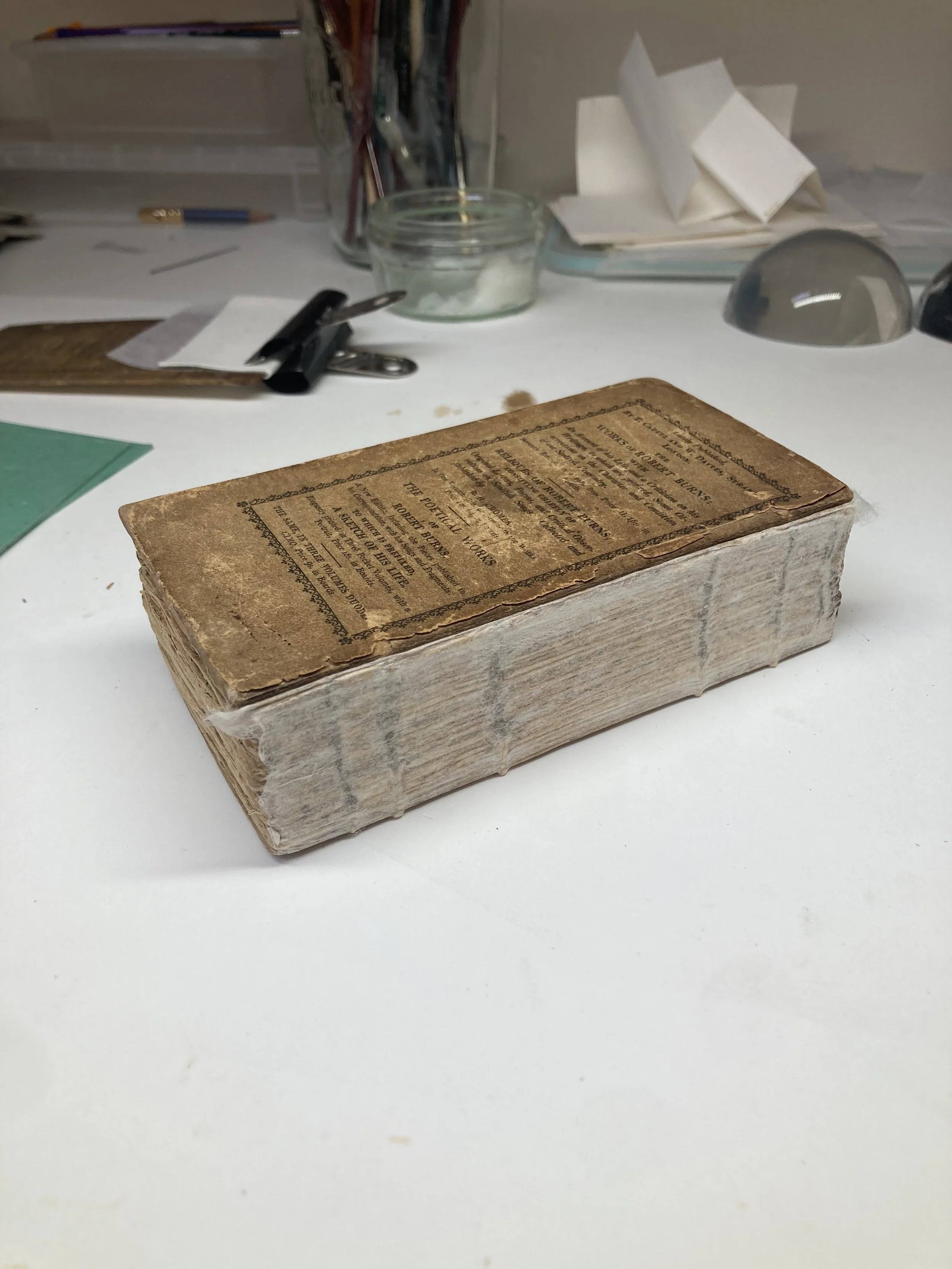 Original spine faced and safely removed. The three gatherings were repaired and resewn back into the textblock with extended cords. Spine lined with Japanese paper. Paper reback with tinted Japanese paper. Original spine readhered. Corner and edge repair of boards.